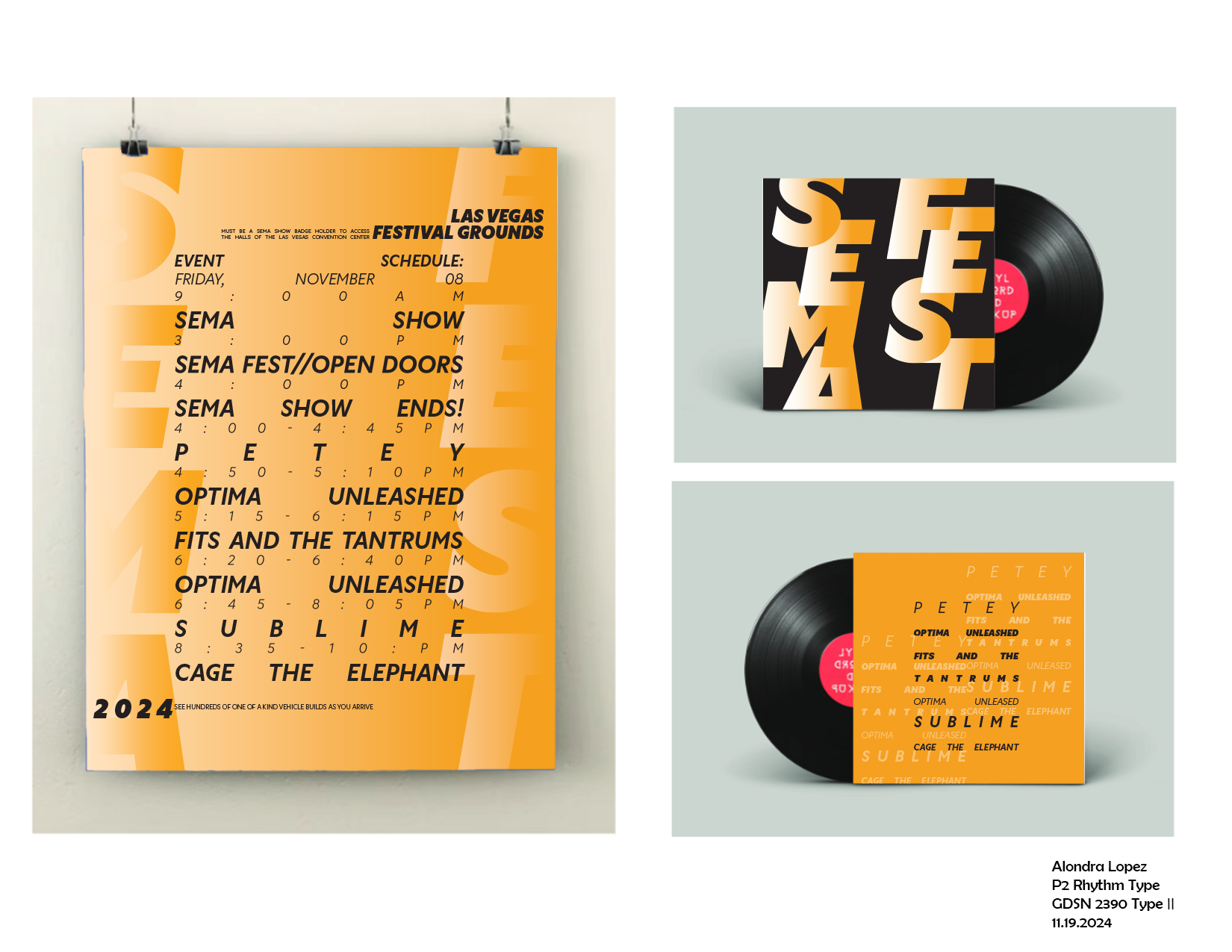 This project is a design based on a music festival around car culture. A music festival poster on the left and to the right a front and back album cover design.
